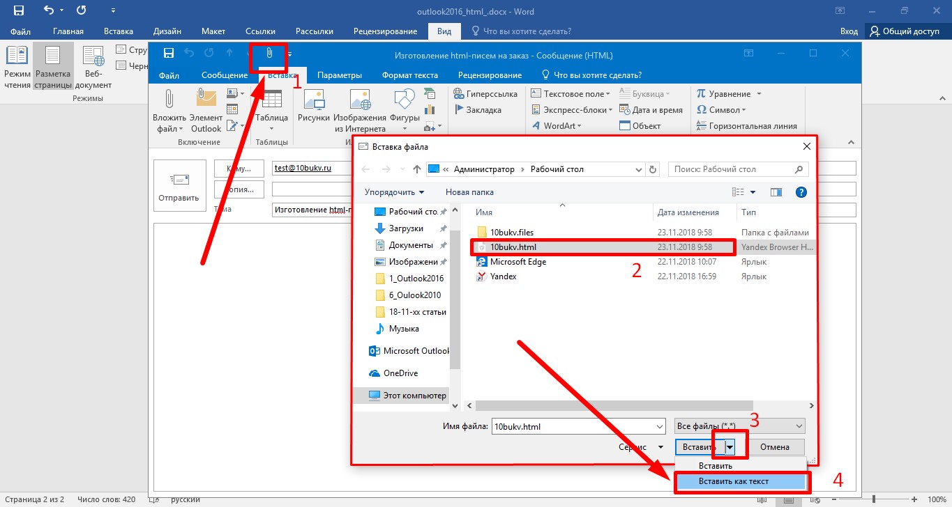 После этой манипуляции в заголовке окна появляется пиктограмма в виде скрепки, «Вложить файл». Её нажатие инициирует диалог для выбора нашей html-заготовки. Когда целевой файл с расширением .html отобразится, выделяем его одинарным кликом мыши и раскрываем список (под треугольником) рядом с командой «Вставить», далее выбираем действие «Вставить как текст».