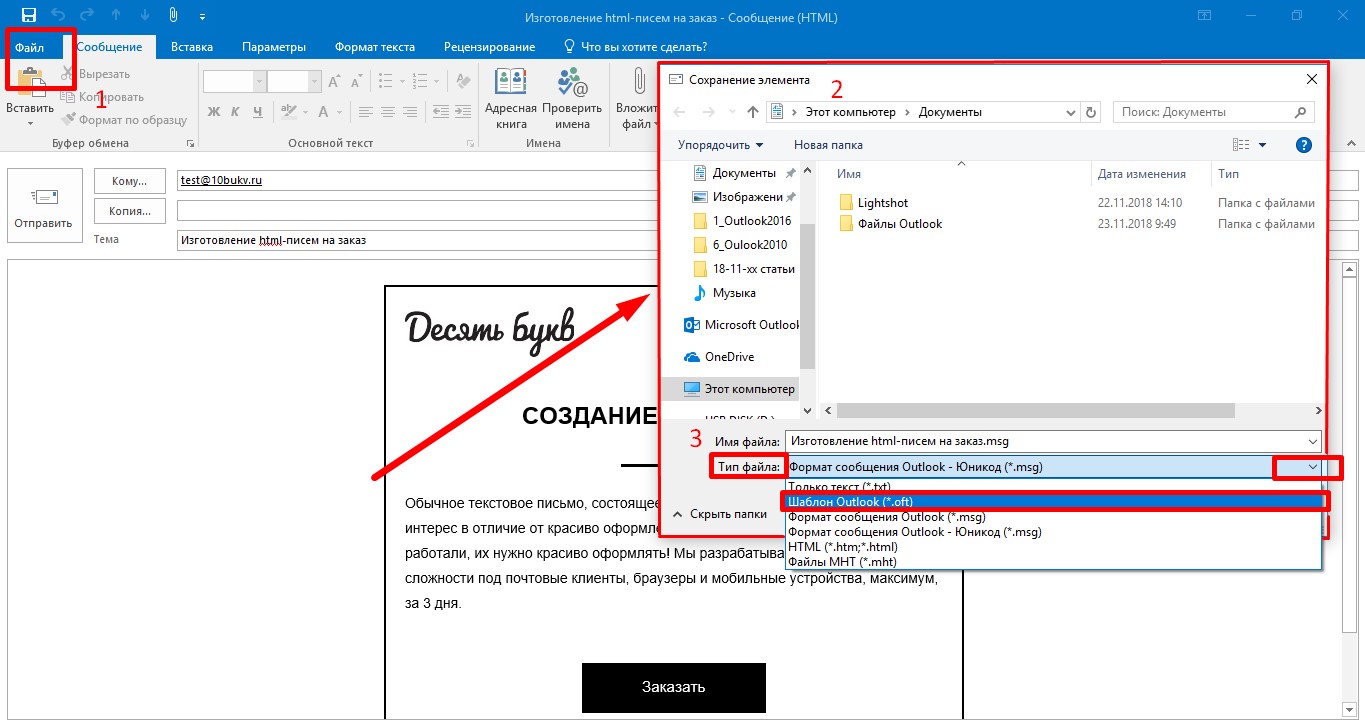 Если возникает задача сохранения созданного html-письма для каких-либо целей, то в Outlook 2016 для этого есть подходящее средство — внутренние шаблоны. Файлы шаблонов для Outlook имеют свой собственный формат, и этот тип файлов распознаётся по расширению .oft