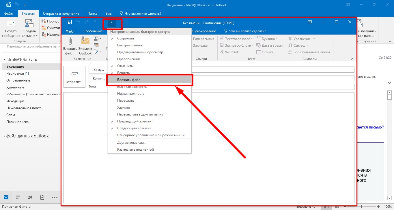 Для размещения кода письма средствами Outlook придётся немного поработать с настройкой интерфейса этой программы. Нам понадобится добавить команду «Вложить файл» на панель быстрого доступа в окне создания сообщений. Отметим сразу, что одноименное действие из группы команд «Вставка» нам не подойдёт, оно предполагает прикрепление файла к письму, а мы же преследуем сейчас иную цель.