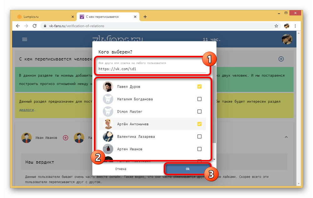 В окне «Кого выберем» вы можете отметить галочкой любых пользователей из списка друзей или указать в строке «Имя друга или ссылка» идентификатор сторонних людей. Чтобы продолжить, выберите двух юзеров, возможно, общающихся между собой, и нажмите «OK».
