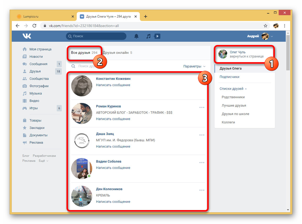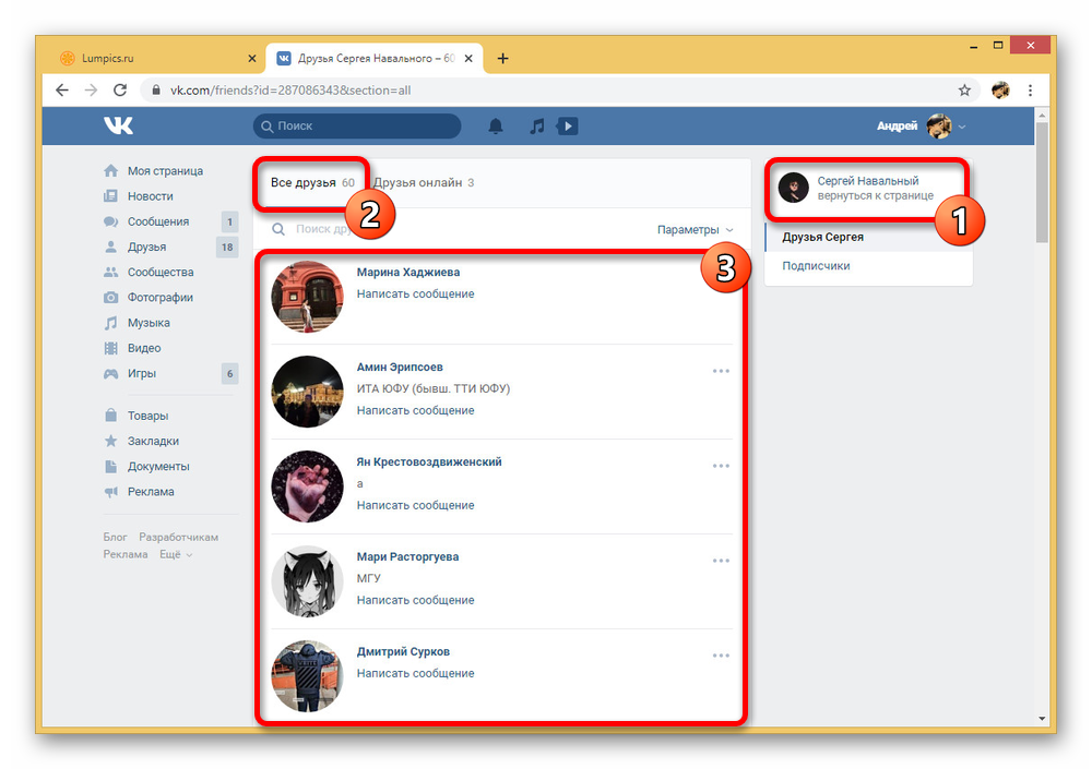 Чтобы произвести проверку, на официальном веб-сайте откройте страницу нужного пользователя и перейдите в раздел «Друзья»
