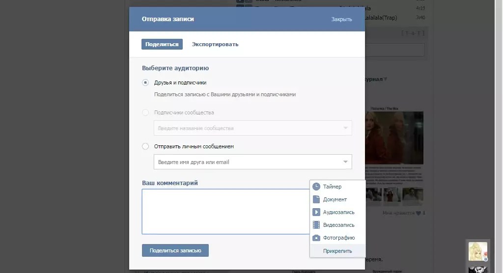 Выполняем все описанные выше действия, только в открывшемся окне выбираем пункт “Подписчики сообщества”. Вы можете прикрепить к посту комментарий, смайлик или вложение.