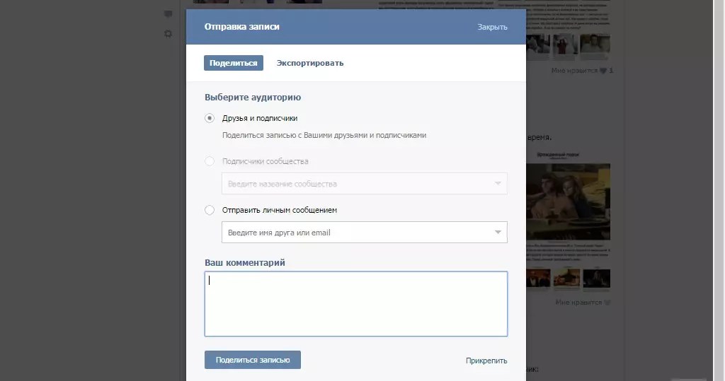 В следующем окне можно добавить комментарий к записи, и выбрать куда именно делаем репост – на стену своей странички (Друзья и подписчики), в собственную группу (Подписчики сообщества) или послать в личные сообщения своему другу (Отправить сообщением). Если хотите отправить запись в общую беседу с друзьями, просто начните вводить название нужного чата.