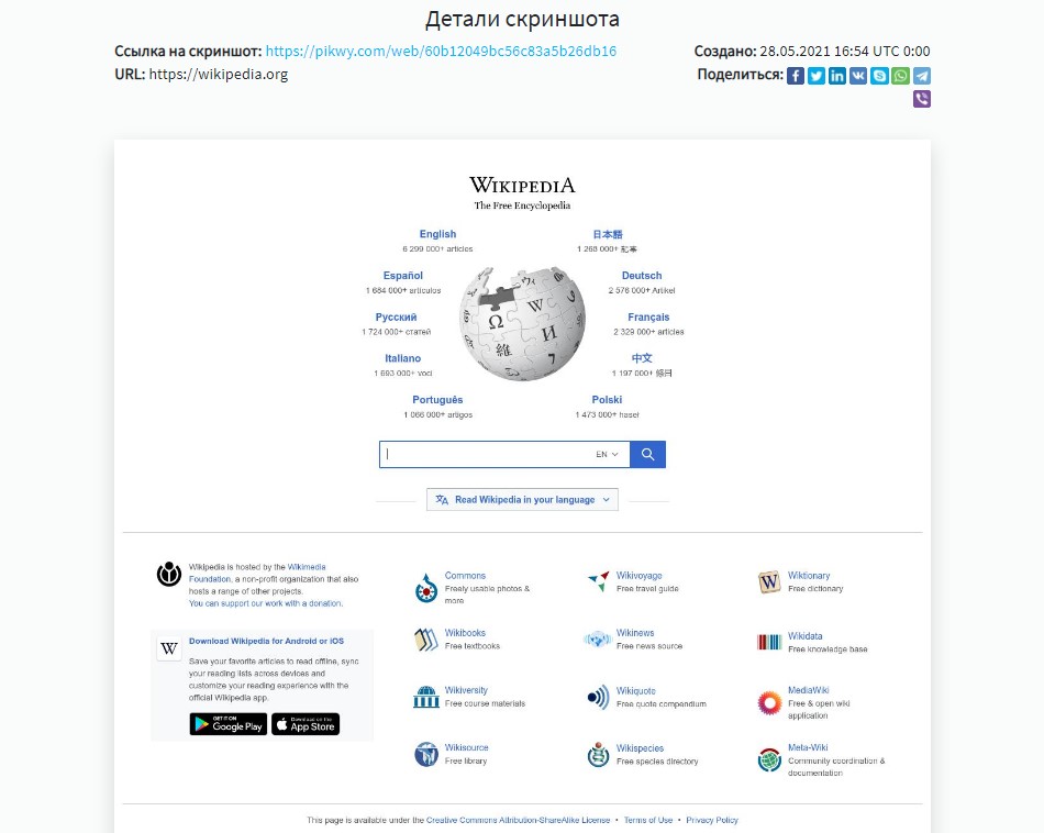 Готовую копию страницы веб-сайта можно скопировать в виде картинки или ссылкой, которая будет опубликована над скрином. Там же вы найдёте активные кнопки «Поделиться» всех самых популярных социальных сетей и мессенджеров, чтобы можно было мгновенно отправить скриншот коллегам или друзьям.