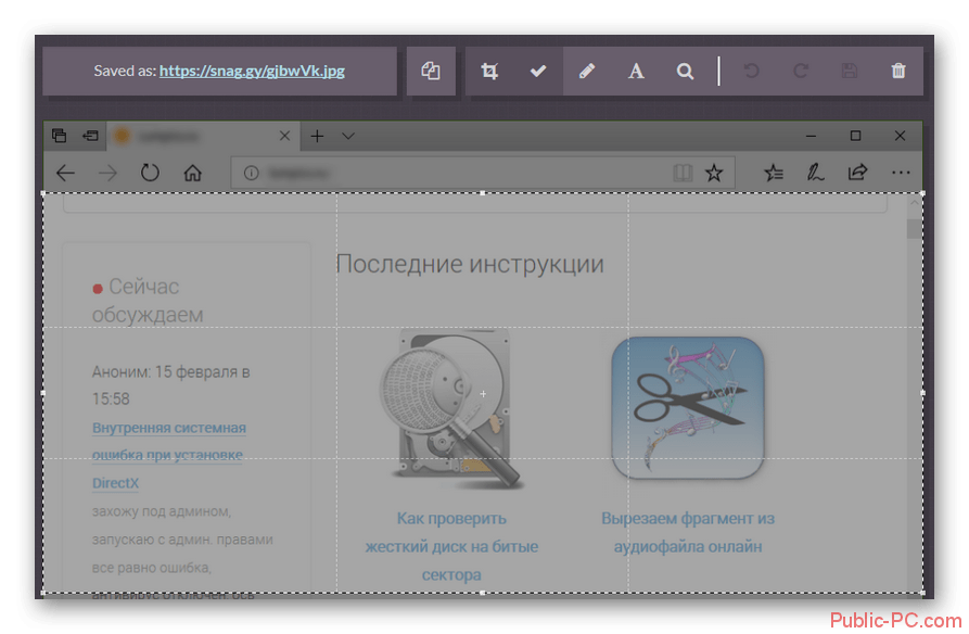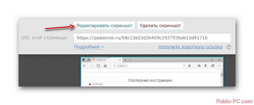 При необходимости измените изображение, кликнув на пункт «Редактировать скриншот». На этом ресурсе предоставлен достаточно широкий выбор различных инструментов, таких как: кадрирование, текст и рисование. Так же есть возможность сделать пикселизацию определенной области скриншота.