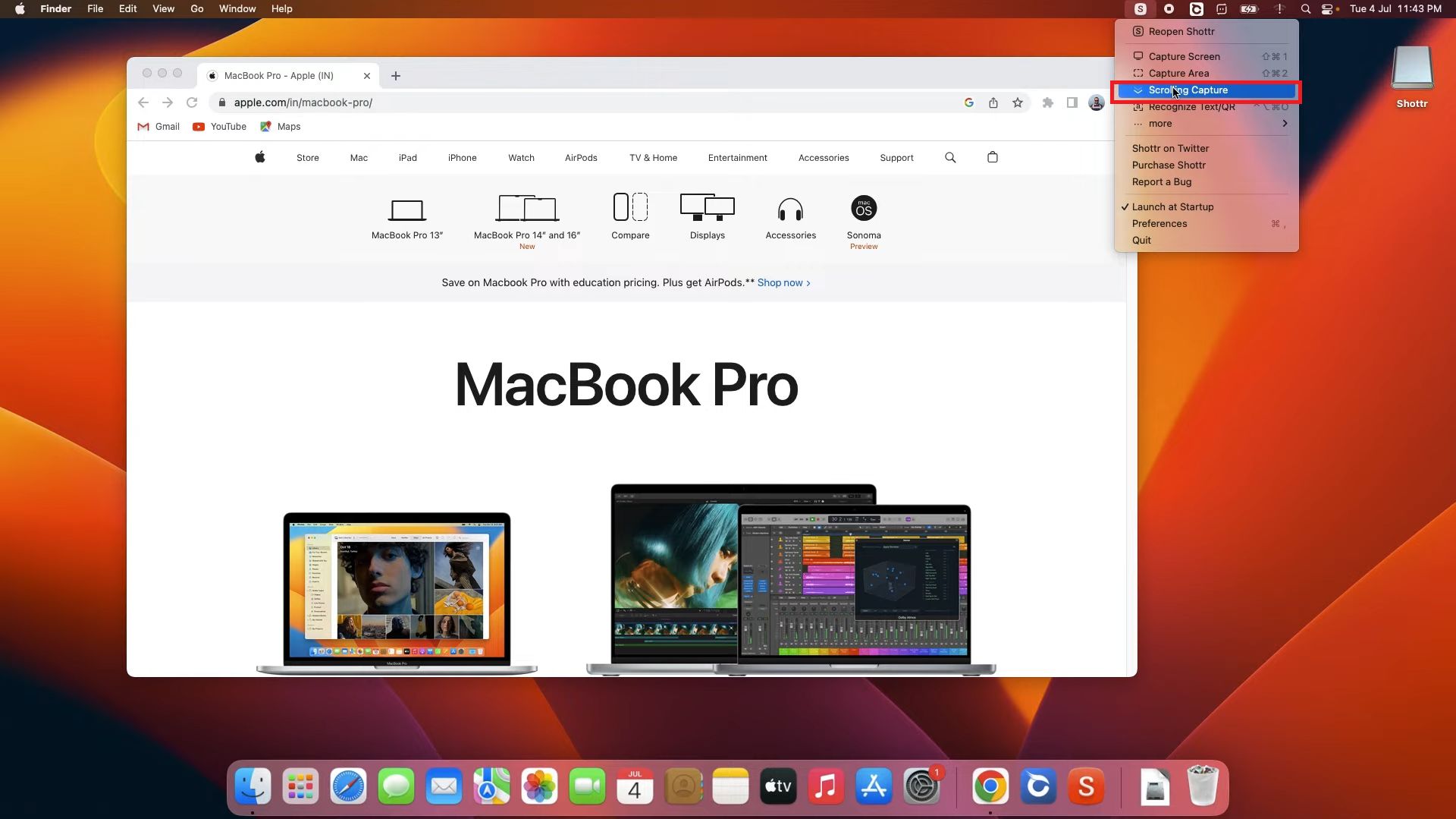 После установки программы ее значок появится на верхней панели. Чтобы начать создание фото, нажмите на значке Shottr. Появится контекстное меню, в котором нужно выбрать «Scrolling Capture».