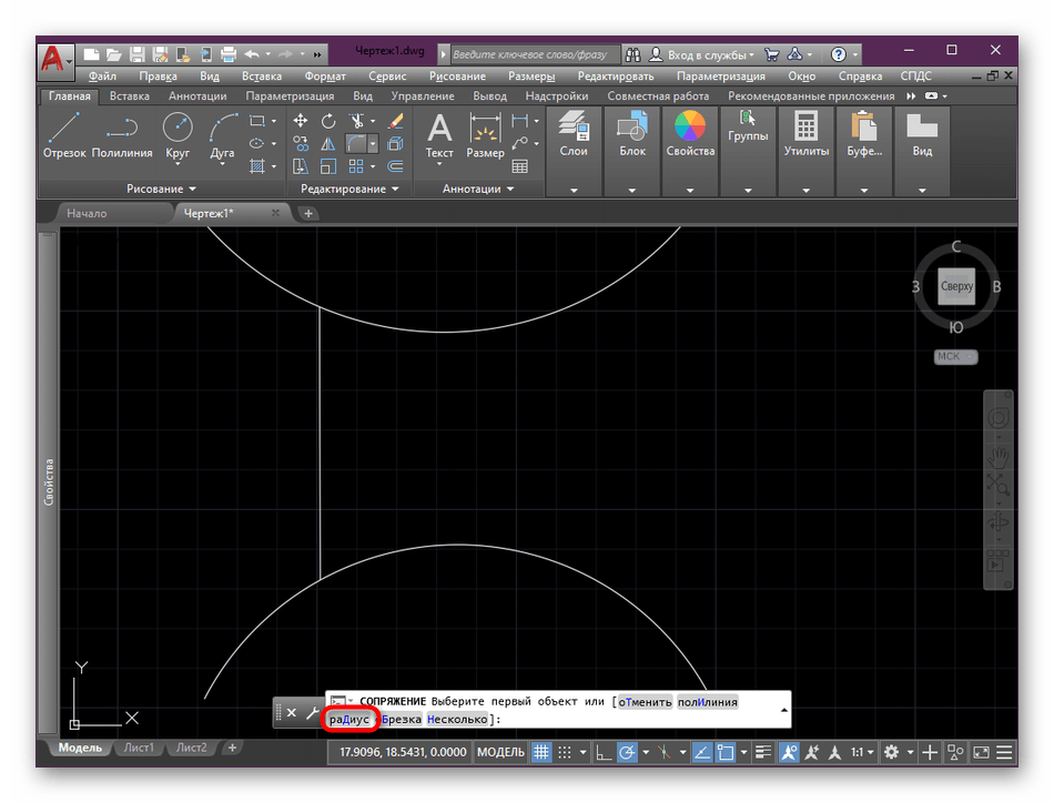 Чуть выше мы с вами разобрали, как неправильно производить сопряжение. Как же правильно сделать сопряжение в Автокаде? Разберём алгоритм действий. Выбираем опцию. Выберите параметр «Радиус».
