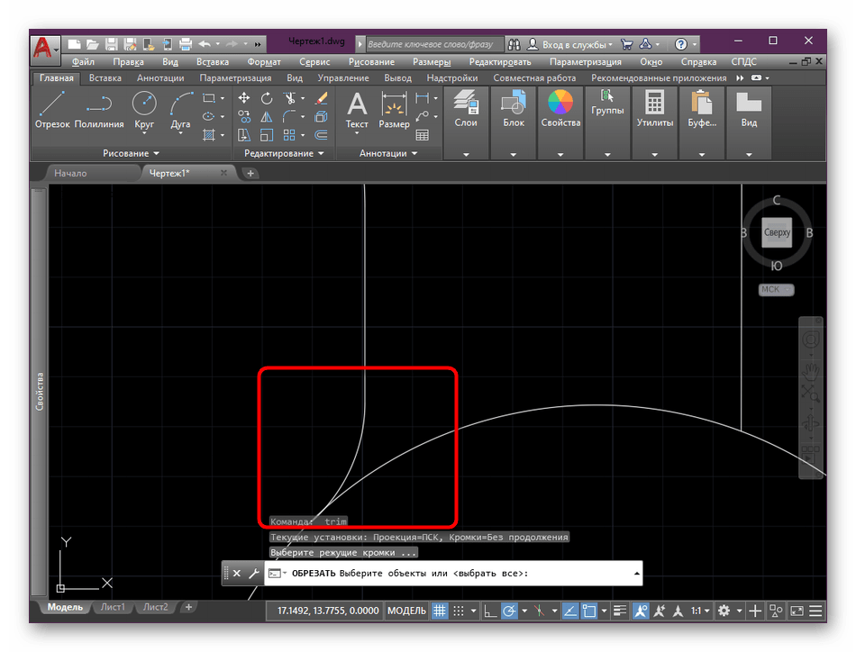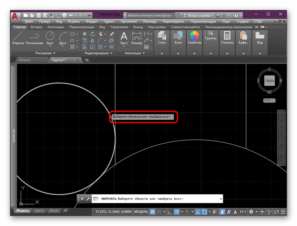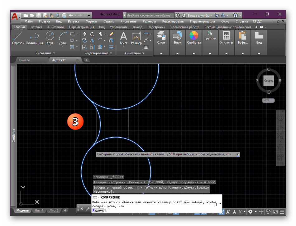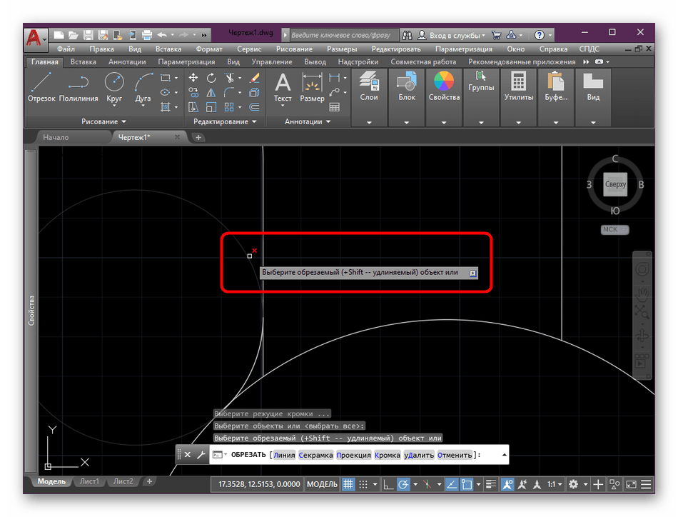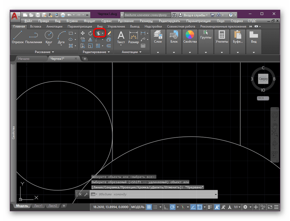 При внимательном изучении скриншотов выше вы могли заметить, что часто из-за сопряжения остаются лишние фрагменты круга или других объектов, которые нужно удалить. Если с независимым отрезком можно попрощаться, просто нажав на DEL, то с частью круга так не получится. Для этого понадобится проделать следующее: