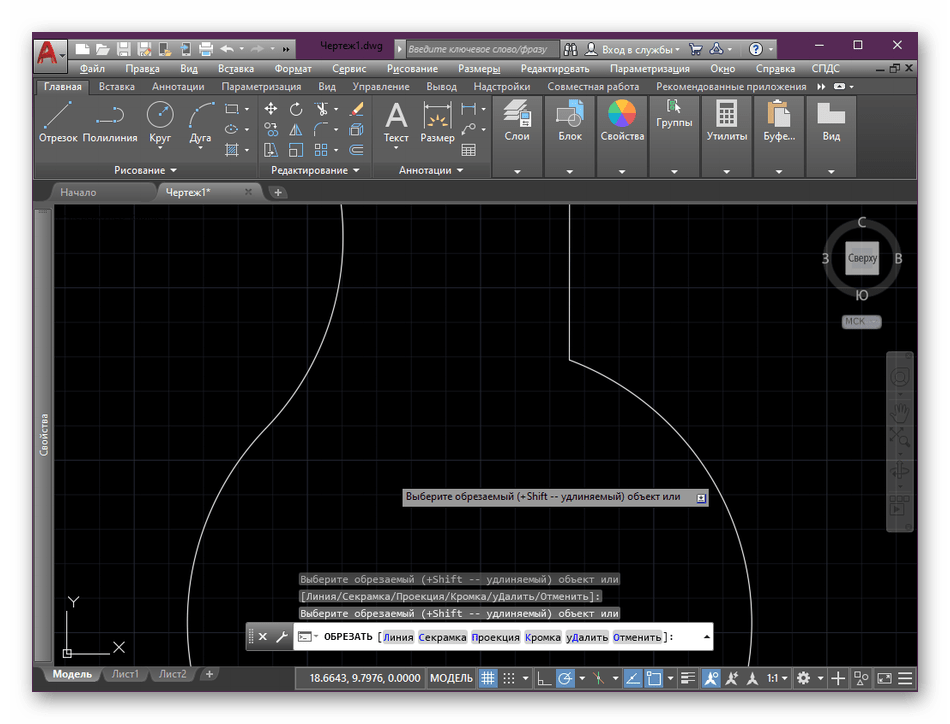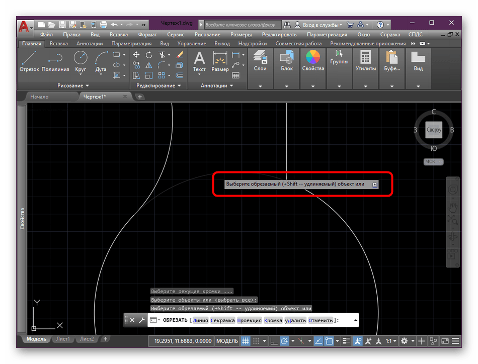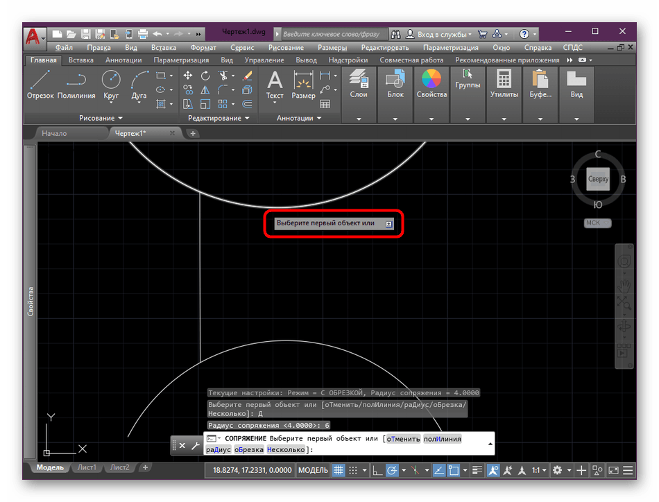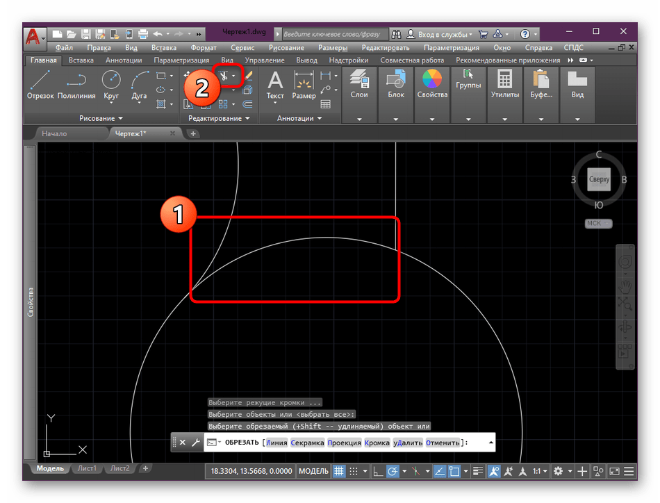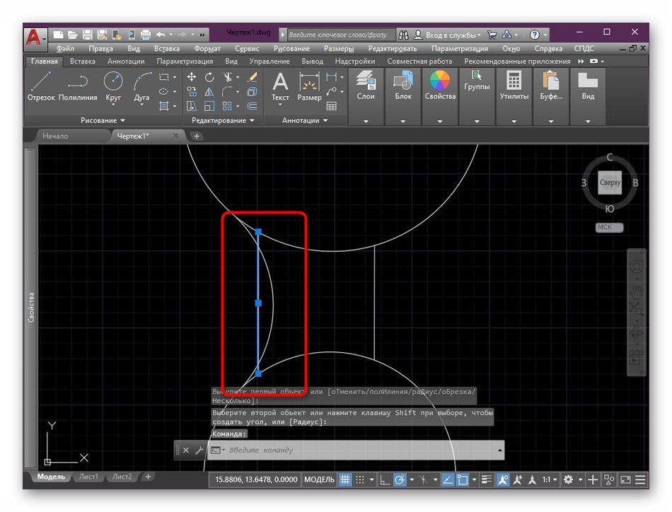 При внимательном изучении скриншотов выше вы могли заметить, что часто из-за сопряжения остаются лишние фрагменты круга или других объектов, которые нужно удалить. Если с независимым отрезком можно попрощаться, просто нажав на DEL, то с частью круга так не получится. Для этого понадобится проделать следующее: