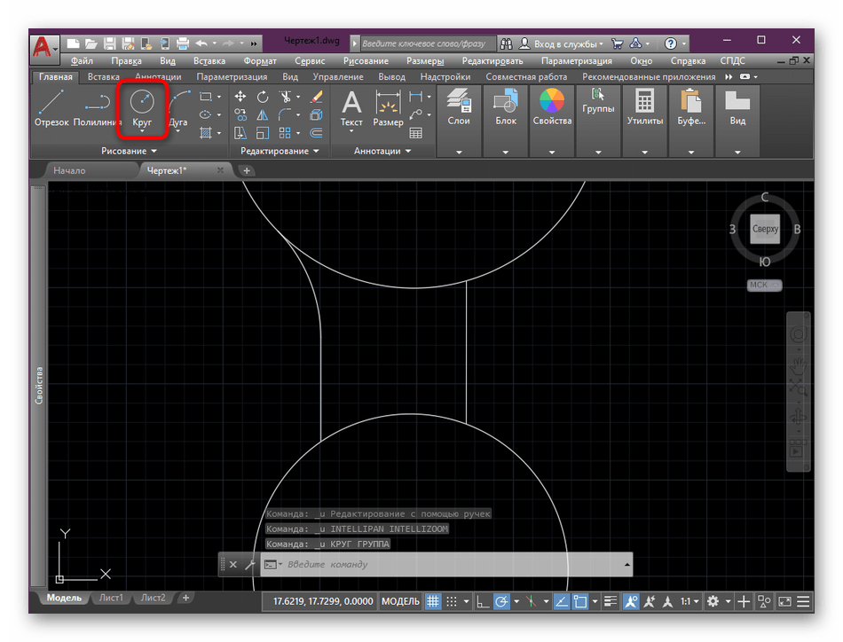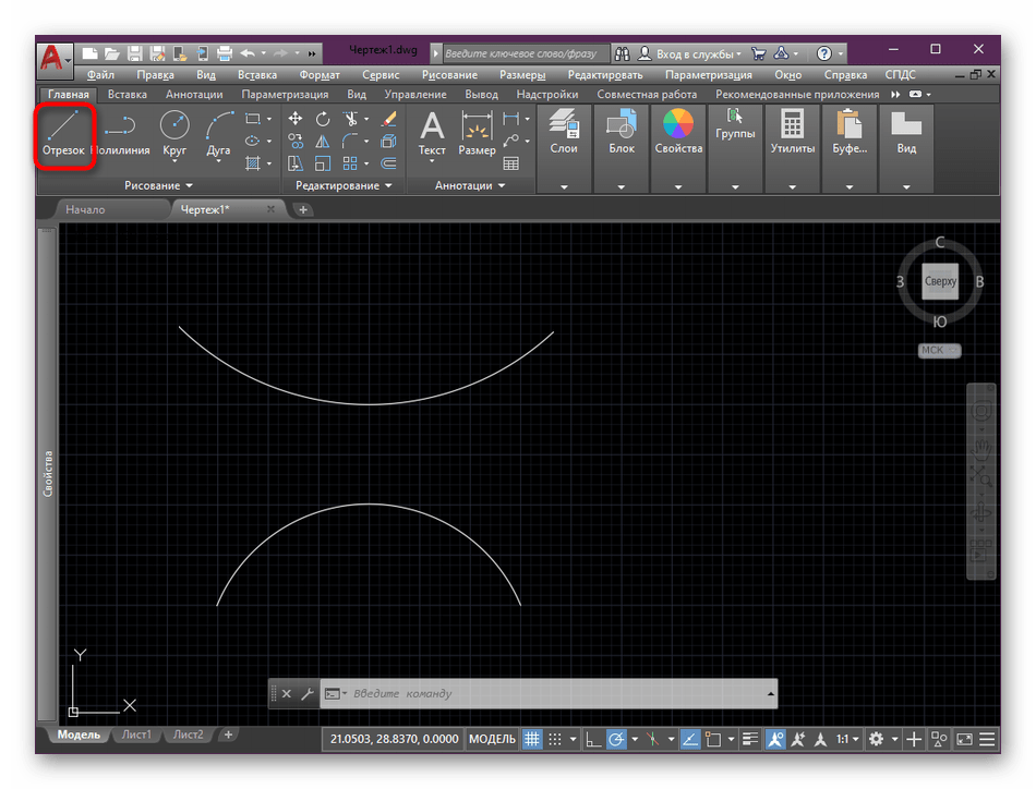 - Давайте разберем эту операцию на примере двух кругов и отрезков между ними. Для начала активируйте рассматриваемый инструмент.