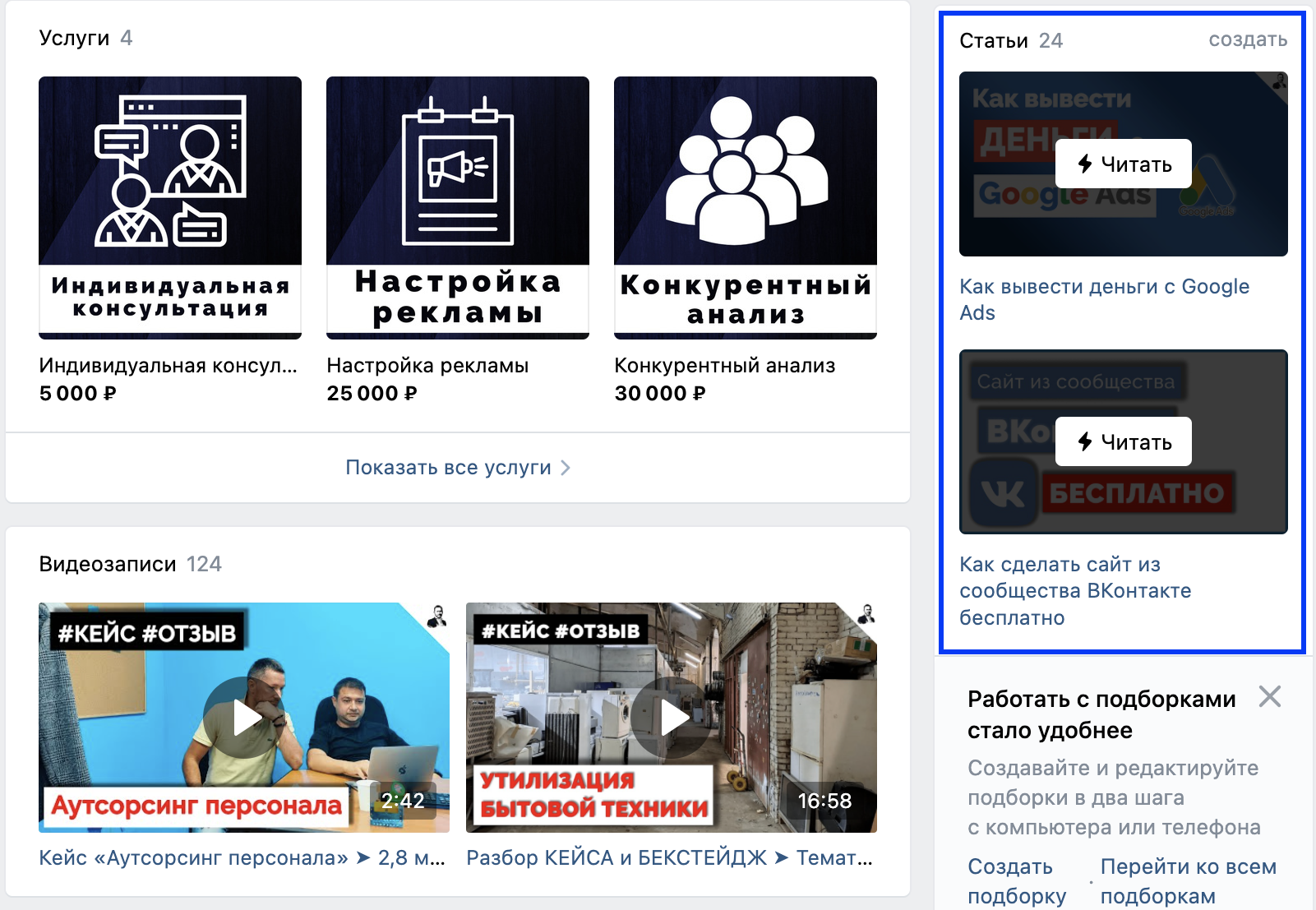 Сюда можно загружать вебинары, видеоуроки, процесс работы, обзоры товаров, отзывы клиентов. К каждому видео добавляйте превью и ссылки и загружайте напрямую через ВК.