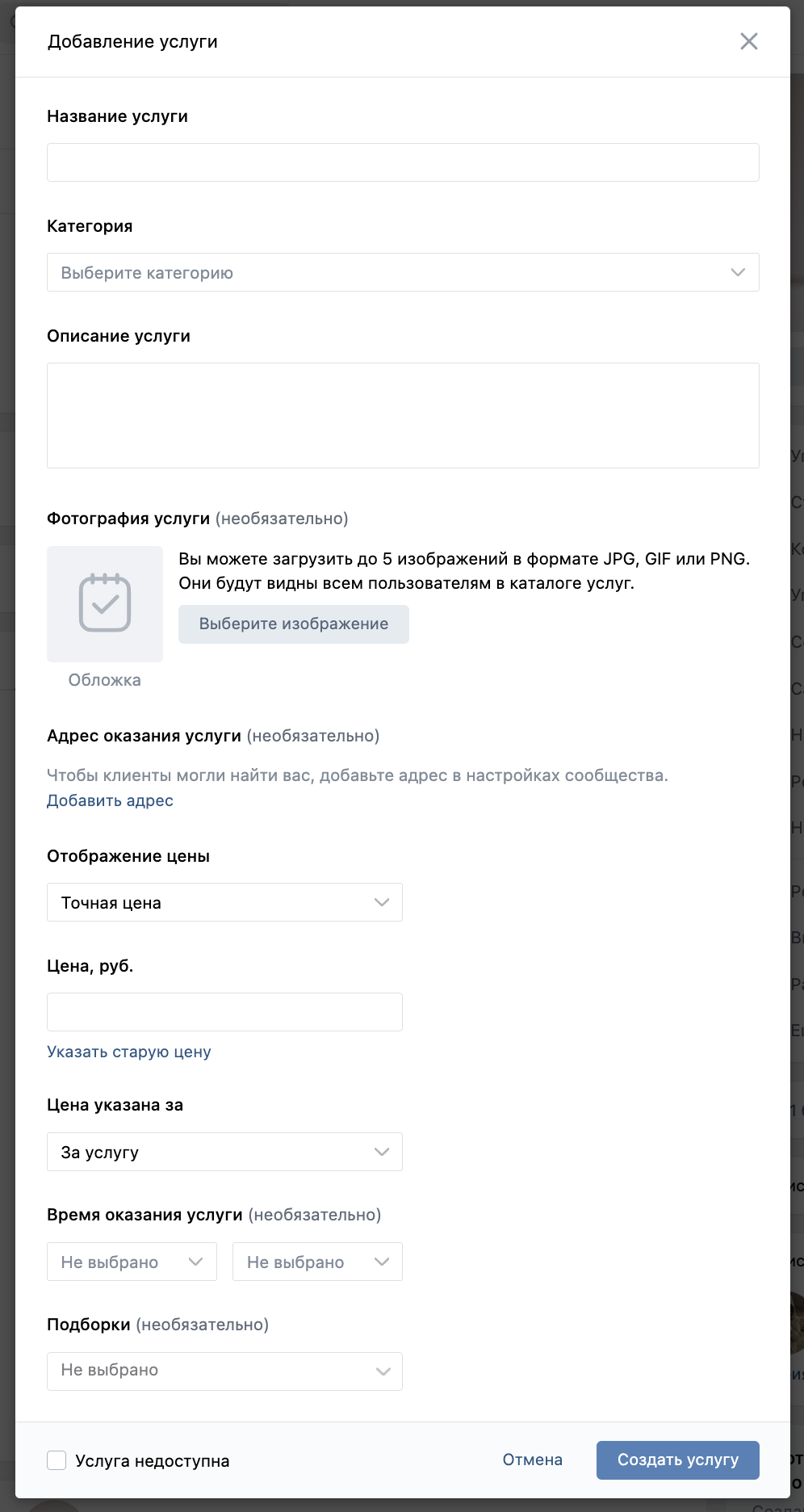 Чтобы добавить услугу на главной странице сообщества нажмите Добавить услугу.