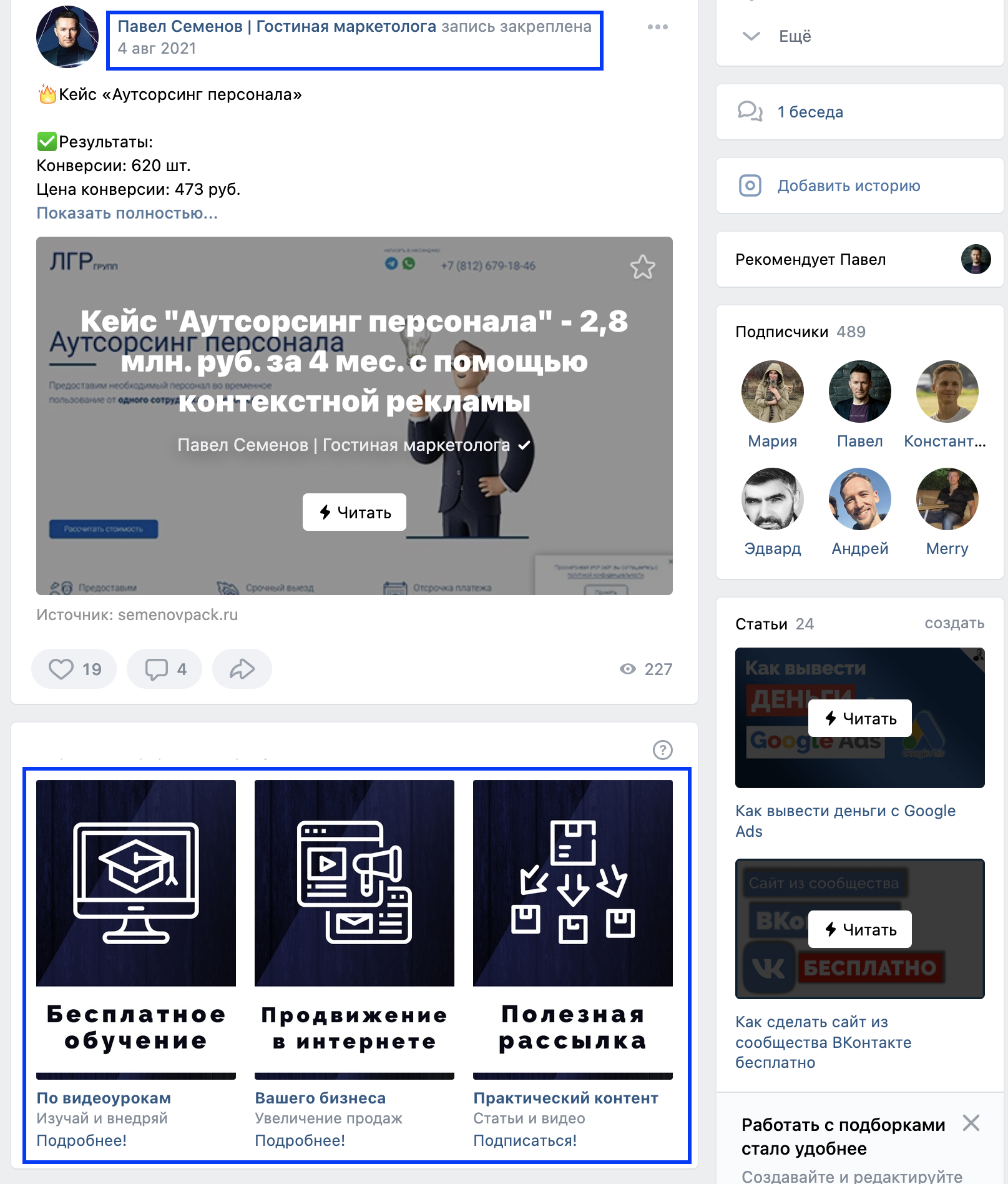 Создавайте полезный контент в виде статей по вашей тематике. В статью можно добавлять изображения, видео, аудио, анимацию. С помощью статистики вы сможете узнать какие материалы пользуются популярностью у вашей аудитории и какие темы в дальнейшем стоит включить в контент-план.