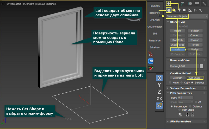Теперь используйте на прямоугольнике сам инструмент. Находится он в Create – Geometry – Compound Objects – Loft. Нажав Get Shape, можно задать форму, которая будет идти вдоль пути. Инструмент автоматически создаст раму. Саму поверхность зеркала можно сделать, используя Plane.