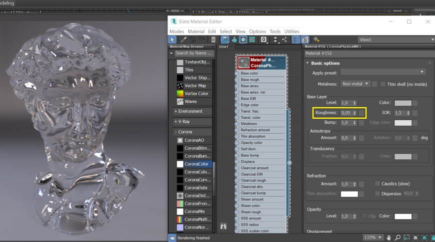 Но, если просто увеличить значение до 1, то объект не станет полностью прозрачным, а будет матовым. В предыдущих версиях Corona за матовость отвечало отдельное значение, которое влияло только на прозрачность. У физического материала есть только один Roughness. Он одновременно управляет и матовостью отражений, и матовостью прозрачности стекла.