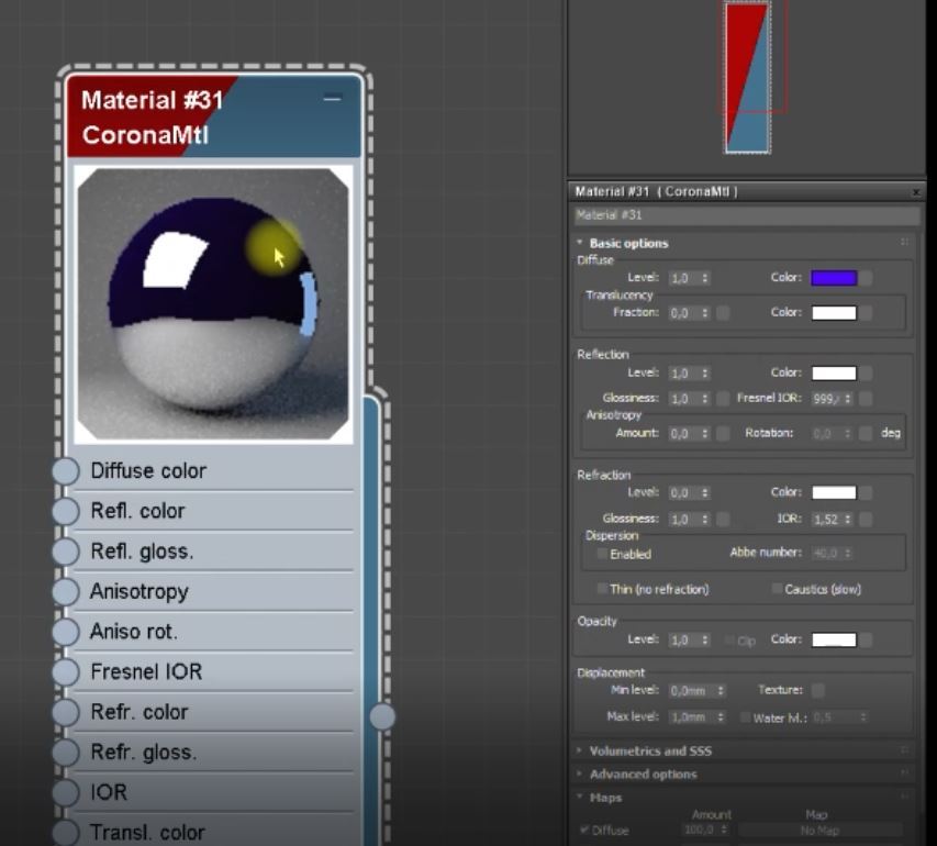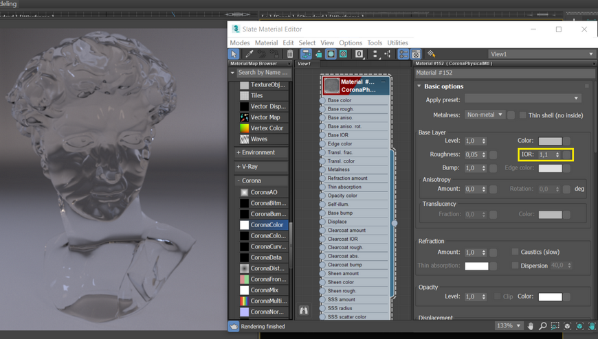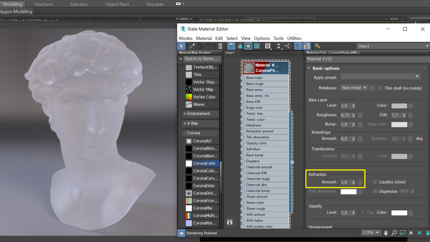 Refraction – свойство прозрачности объекта. Именно оно позволяет превратить материал в стекло. В предыдущих версиях Corona отражения и прозрачность не зависели друг от друга. Теперь же Refraction напрямую зависит от настроек отражений.