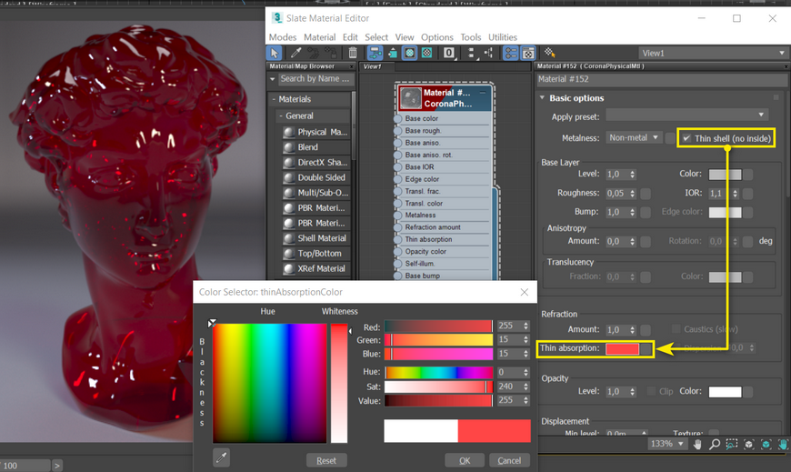 Эта функция находится в разделе Refraction и можно подумать, что с ее помощью настраивается цвет стекла. Но по умолчанию она заблокирована. Чтобы настраивать цвет, стеклу придется установить нулевую толщину геометрии. Тогда функция откроется и можно настраивать цвет.