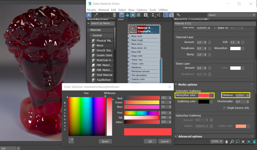 Свойство волюметрики сохранилось с предыдущих версий Corona. Как и раньше, здесь просто настраивается цвет и устанавливается Distance — глубина проникновения света. Волюметрика наиболее полноценно учитывает толщину геометрии: выглядит темнее, где толщина больше, и светлее, где тоньше. Этот вариант был и остается самым реалистичным и эффектным способом настройки цветного стекла.