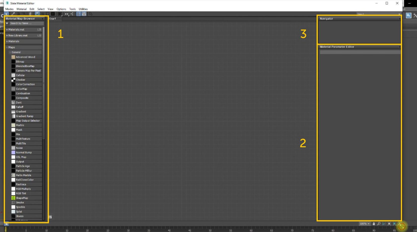 1 – просмотрщик по библиотекам материалов и текстур;2 – параметры;3 – общая навигация.