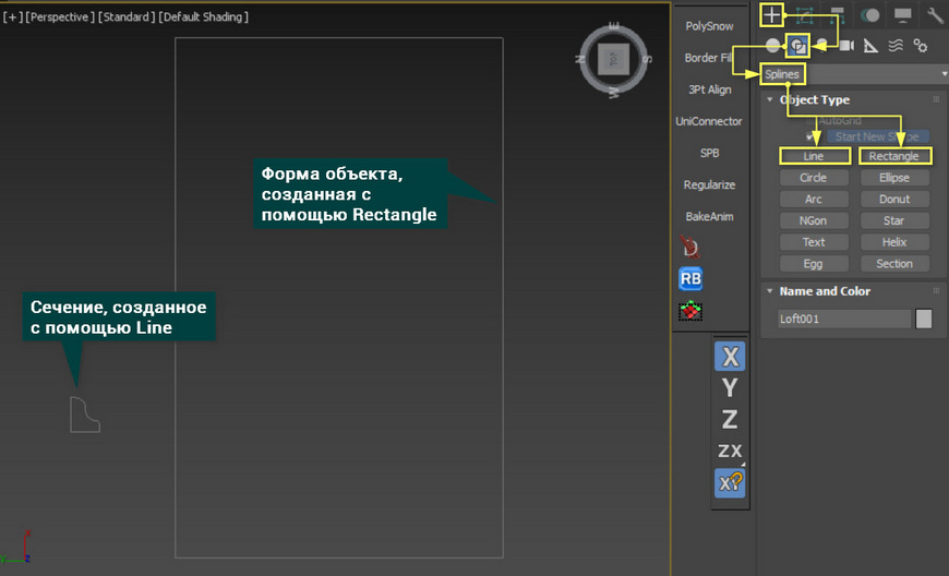 Для создания рамы стоит воспользоваться инструментом Loft. Сначала создайте форму сечения и путь для этой формы с помощью Create – Shapes – Splines. Форма сечения — это «разрез» багетной рамы, построенный с помощью Line. Путь – это прямоугольная форма самой рамы, созданная из Rectangular. Также можно использовать и другие формы, описанные в статье «Splines в 3ds Max и работа с ними»