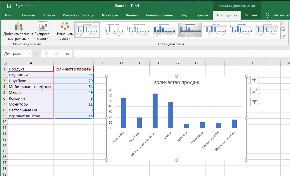Выбрав данные, выберите опцию вставки диаграммы.