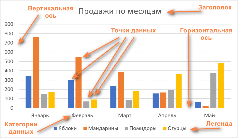 Сразу же отметим, что столбчатая диаграмма в таблице Excel по сути является графиком. Чтобы создавать любой график, нужен набор данных, состоящий минимум из двух категорий. При этом первая из них отображается по оси X, а вторая — по оси Y.
