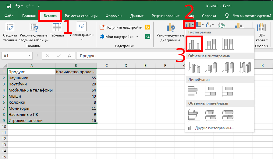 - Выделить таблицу, через раздел «Вставка» выбрать подходящее изображение гистограммы.