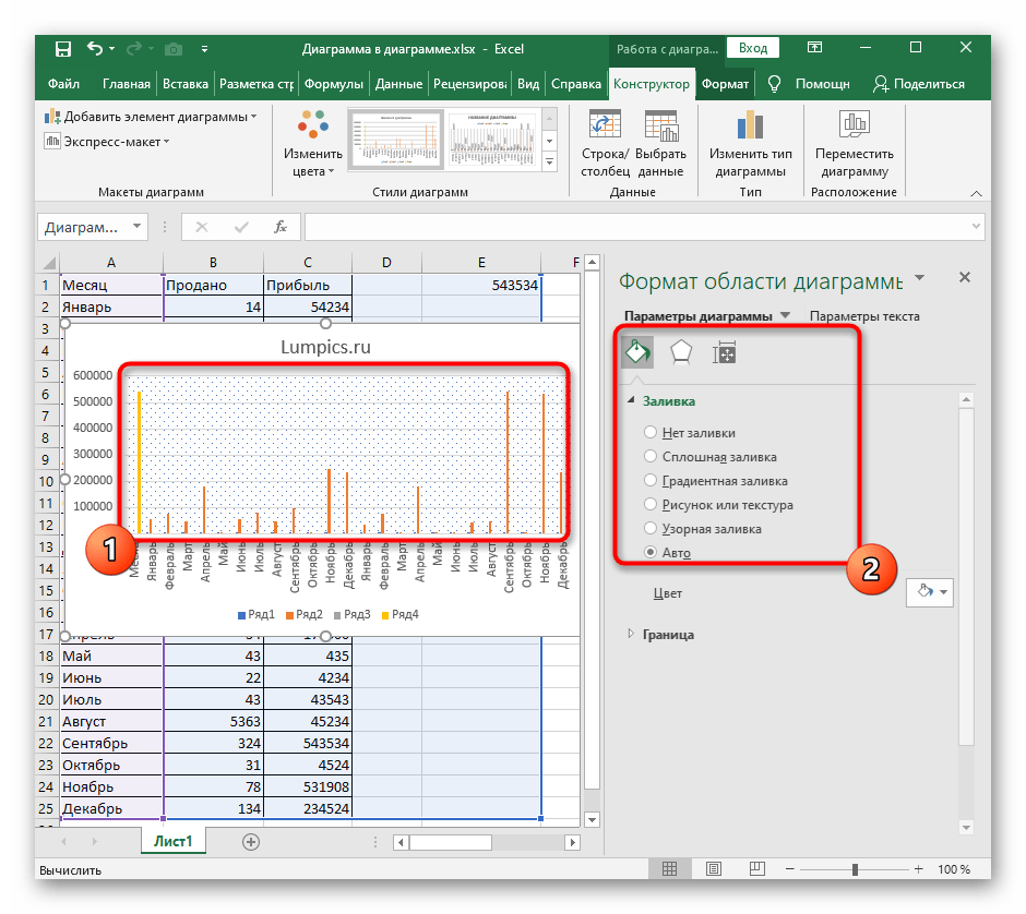 При двойном нажатии по основному пространству диаграммы появится настройка заливки, где в качестве фона вы можете установить любой цвет, градиент или даже загрузить изображение.
