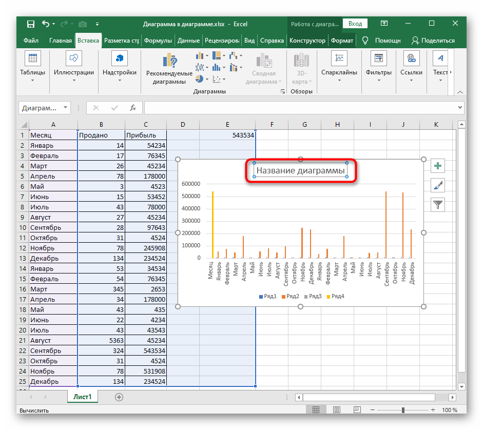 - По необходимости выделите таблицу, вокруг которой строится график, а если на листе она одна, сразу переходите на вкладку «Вставка».