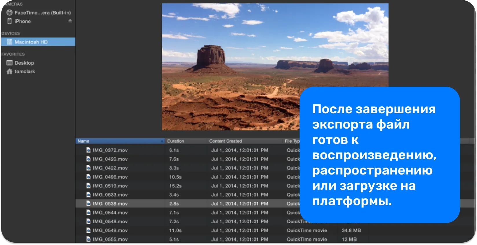 Экспортируйте видеоклипы из медиатеки iMovie, готовые к использованию в следующем кинематографическом проекте.