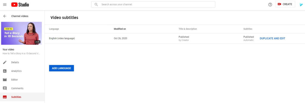Кроме того, вы можете добавить свои собственные субтитры к любому видео на YouTube через учетную запись YouTube Studio. Просто войдите в систему, выберите «Субтитры» в меню в левой части экрана и выберите свое видео. Затем выберите язык субтитров и нажмите «добавить».