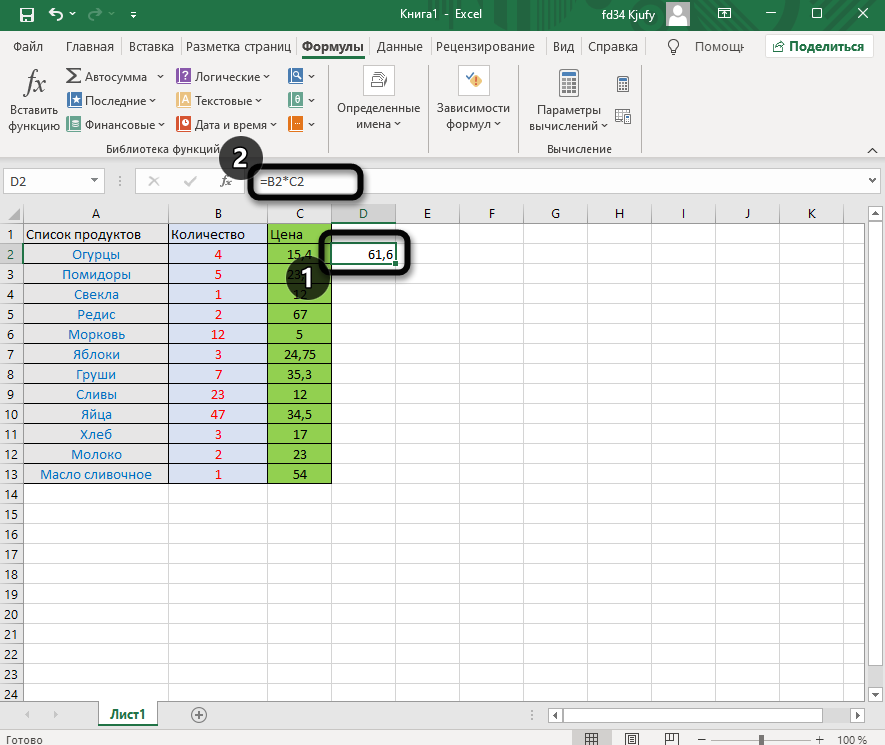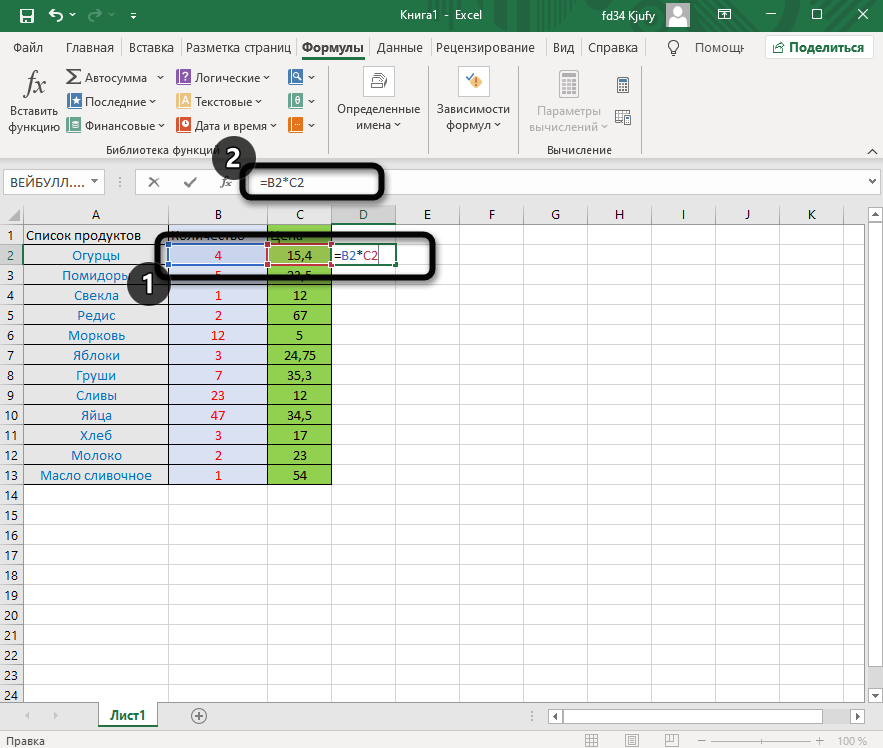 Взгляните на следующее изображение. Это пример самой простой функции, результатом которой является сумма указанного диапазона ячеек или двух из них. В данном случае знак «:» означает, что все значения ячеек указанного диапазона попадают под выражение и будут суммироваться. Все формулы разобрать в одной статье нереально, поэтому читайте официальную справку по каждой или найдите открытую информацию в сети.