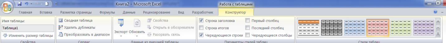 С выходом новых версий программы работа в Эксель с таблицами стала интересней и динамичней. Когда на листе сформирована умная таблица, становится доступным инструмент «Работа с таблицами» — «Конструктор».