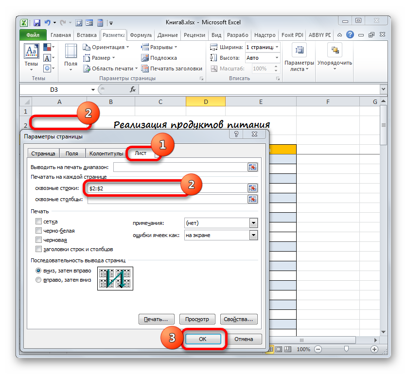 - В графе «Параметры страницы» кликнуть по кнопке «Печатать заголовки».