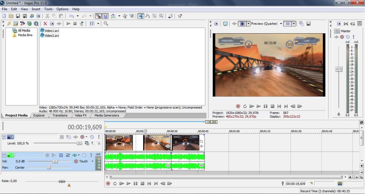 Для начала закиньте пару файлов на timeline. Если вы вдруг не помните или не знаете как это можно сделать, то вы можете прочитать урок — Как испортировать видео в Sony Vegas Pro — 4 способа.