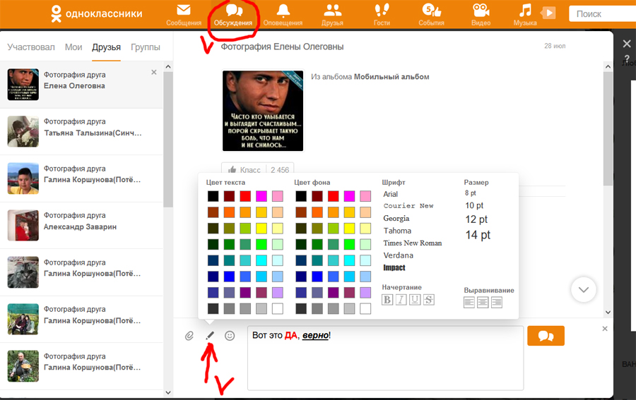 Открываете вкладку Обсуждения или в группе, там у вас будут вкладки «Участвовал, Мои, Друзья, Группы». Пишете комментарий и находите слева значок «Ручка». Жмёте на неё и форматируете свой текст. Можно изменить шрифт, размер, цвет и жирный-курсив-наклонный-зачёркнутый.