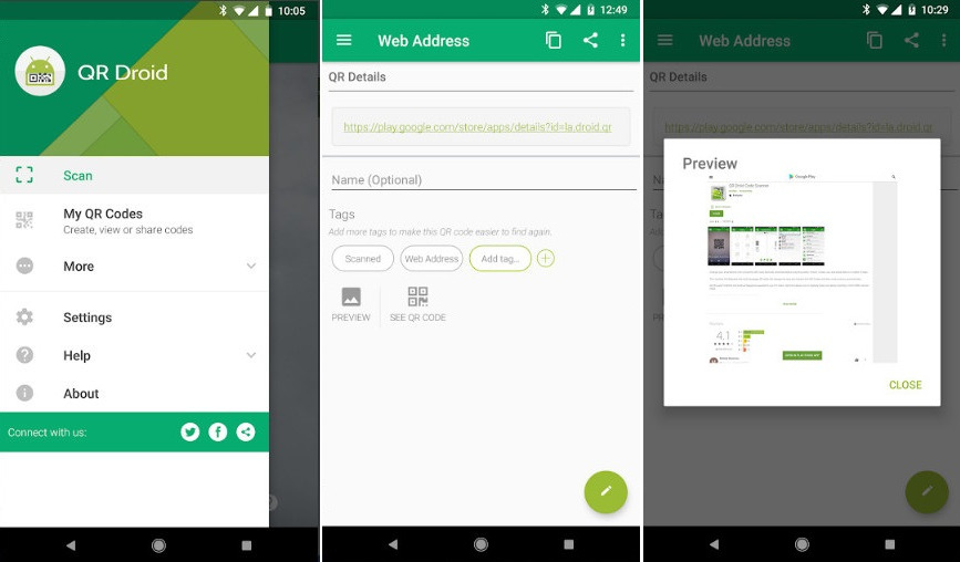 Добротный сканер QR-кодов для Андроид, отличающийся продвинутым функционалом. Приложением поддерживается сканирование разных типов кодов с камеры, открытых в галерее или браузере изображений, ведение истории, создание QR-кодов и обмен ими, создание XQR-кодов для объемных QR-кодов, использование фонарика и вспышки в условиях плохого освещения. Из дополнительных возможностей следует отметить автооткрытие веб-страниц при получении ссылки, сохранение штрих-кодов, использование виджетов. Принцип работы приложения тот же, что и у Молния QR-сканер.