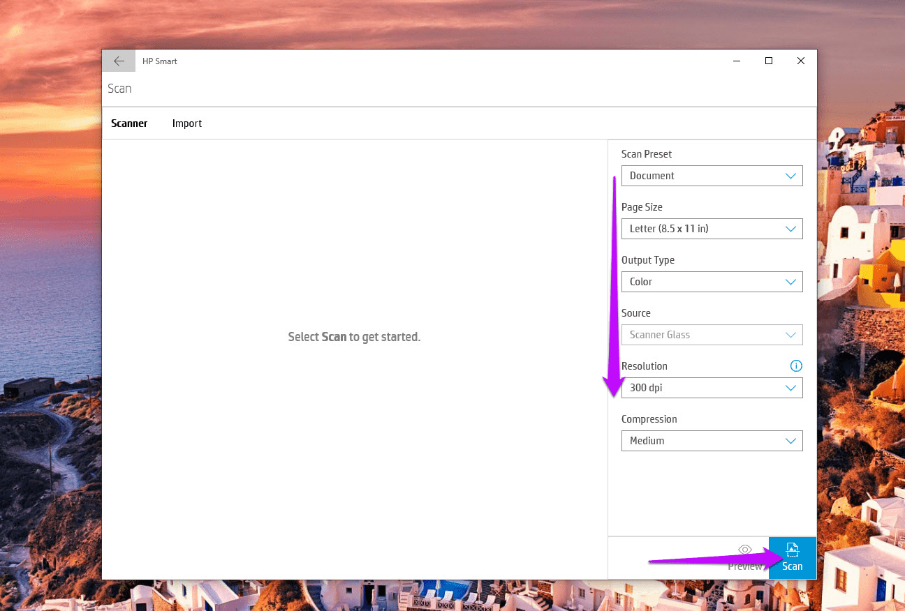 Шаг 4: Нажмите «Сканировать», и вы увидите на экране множество вариантов. Здесь вы можете выбрать тип вывода (цветной или серый), разрешение (самое высокое — 1200 точек на дюйм) и уровни сжатия (средний, высокий и низкий).