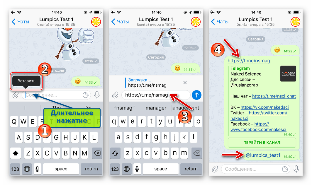 Итак, задачу копирования ссылки на аккаунт Телеграм в среде iOS мы решили, выполнив инструкцию выше. Для дальнейших манипуляций с адресом, то есть его извлечения из буфера обмена достаточно длительно нажать в поле ввода текста любого приложения для iPhone/iPad и затем тапнуть «Вставить».