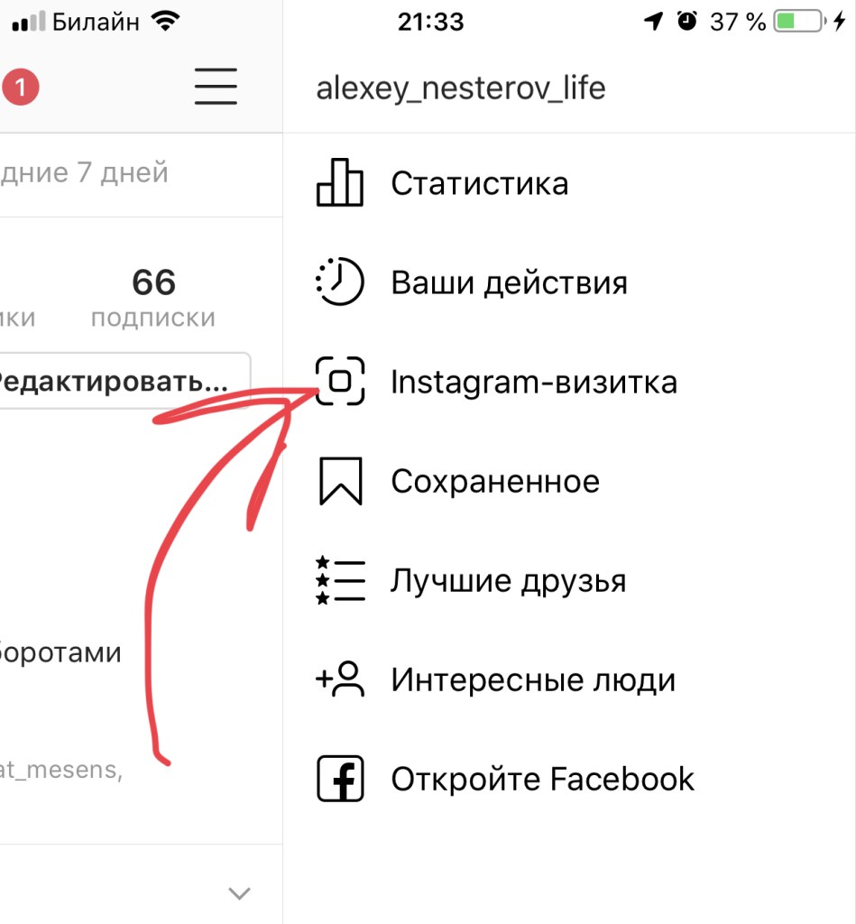 Для того, чтобы ее найти, нажимаете на три точки (или полоски) сверху и нажимаете на «Instagram-визитка».