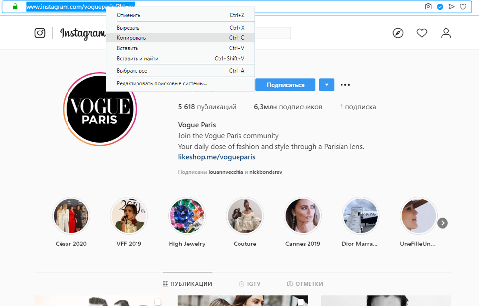 Копирование ссылки на свою страницу Инстаграм с компьютера