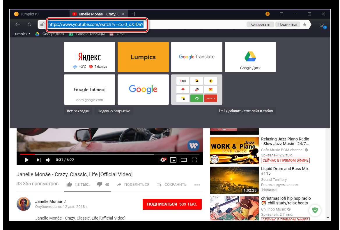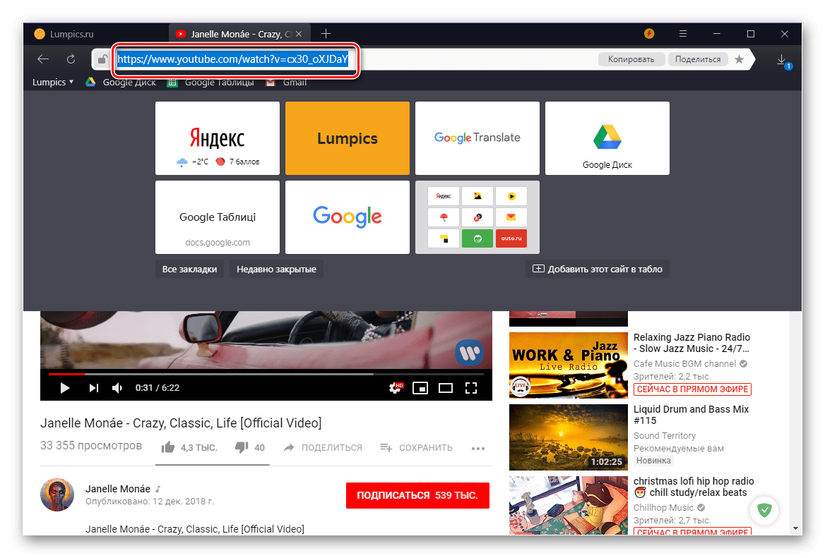 Откройте видео, ссылку, по которой вы хотите скопировать, и щелкните левой кнопкой мыши (ЛКМ) в адресной строке браузера, который вы используете: она должна быть выделена синим цветом.