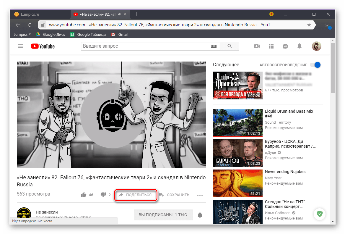 Нажмите ЛКМ на заголовок «Поделиться», расположенный под областью воспроизведения видео,