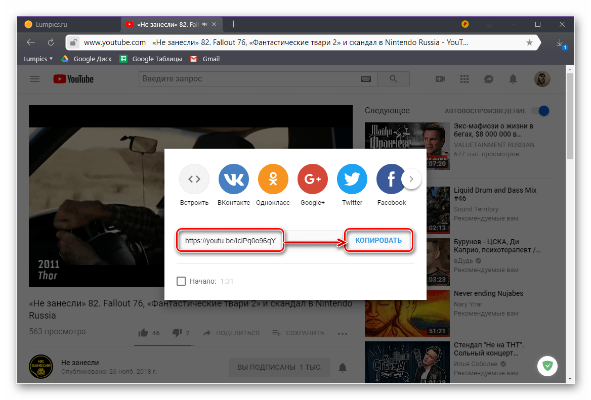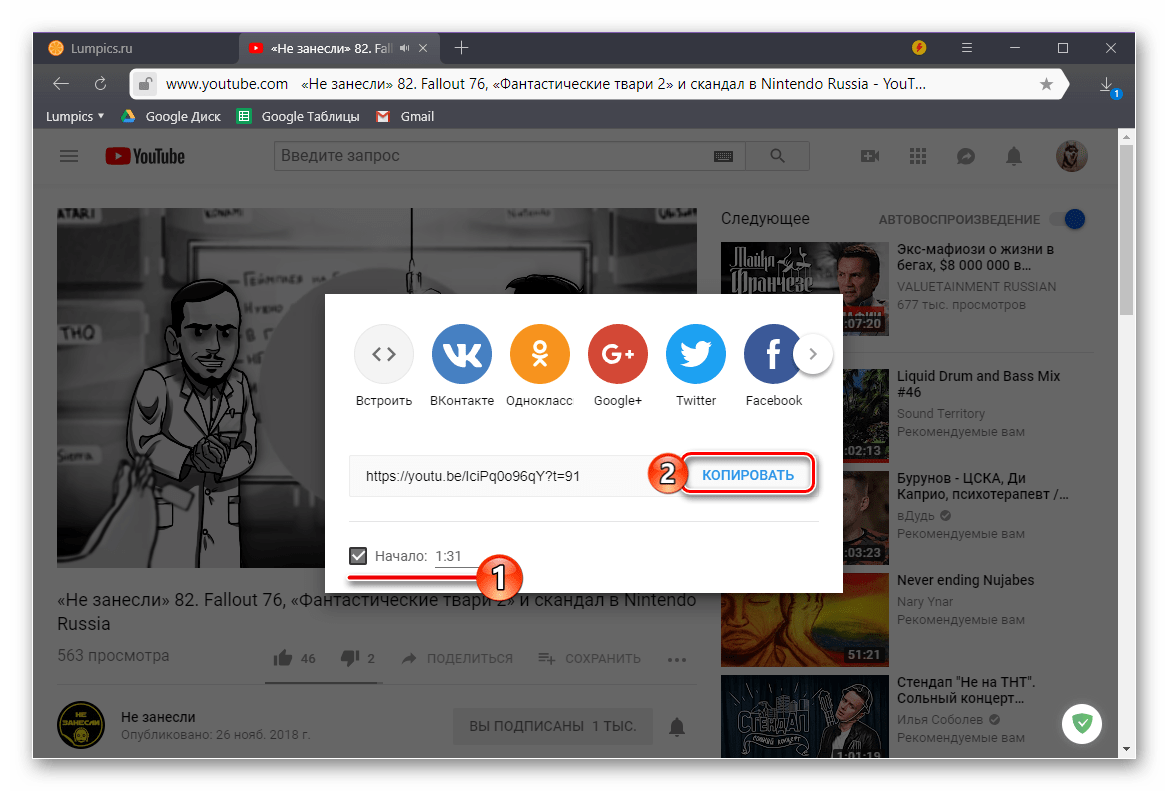 Примечание: Если перед копированием остановить проигрывание, другими словами надавить на паузу, в левом нижнем углу меню «Поделиться» будет возможность получения ссылки на определенный момент записи – для этого необходимо просто установить галочку напротив пт «Начало с №№:№№» и только после чего жать «Копировать».