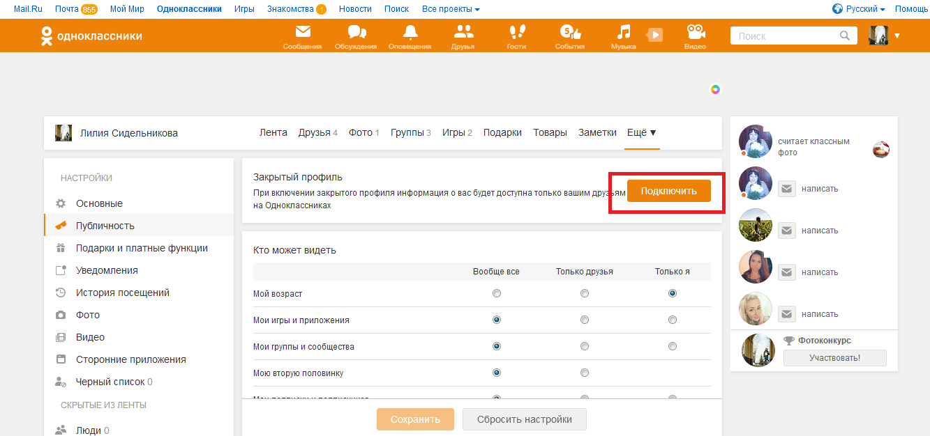 В «Одноклассниках», установленных на телефоне, можно также закрыть профиль. В этом случае нужно пройти в «Настройки публичности» и кликнуть кнопку «Подключить». Услуга предоставляется на неограниченный срок, но за нее придется заплатить 15 ОК.