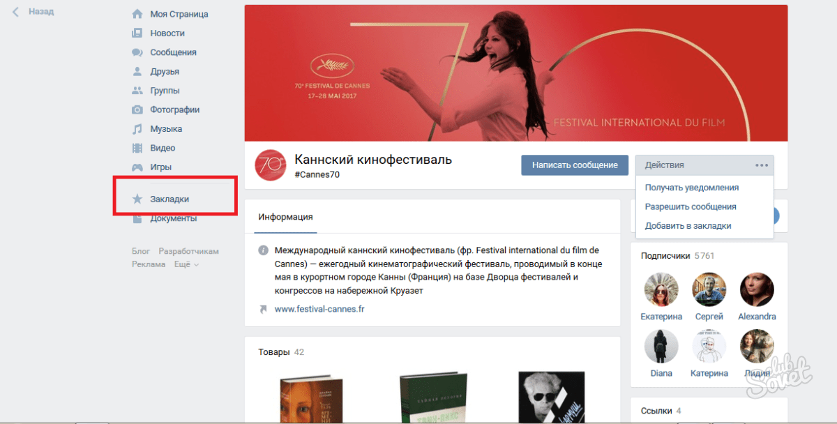 Далее можно нажать на кнопку «Сохранить в закладках». Чтобы увидеть паблик в новом списке, который доступен только самому пользователю, следует перейти в раздел «Закладки» в меню слева.