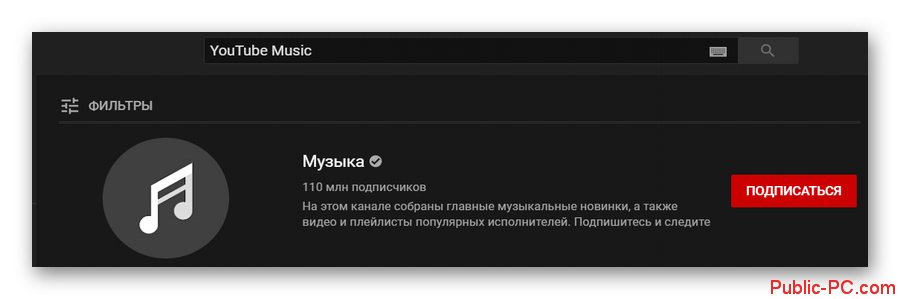 - На первой позиции выдачи будет находится канал с названием «Музыка». Он вам и нужен. Перейдите на него.