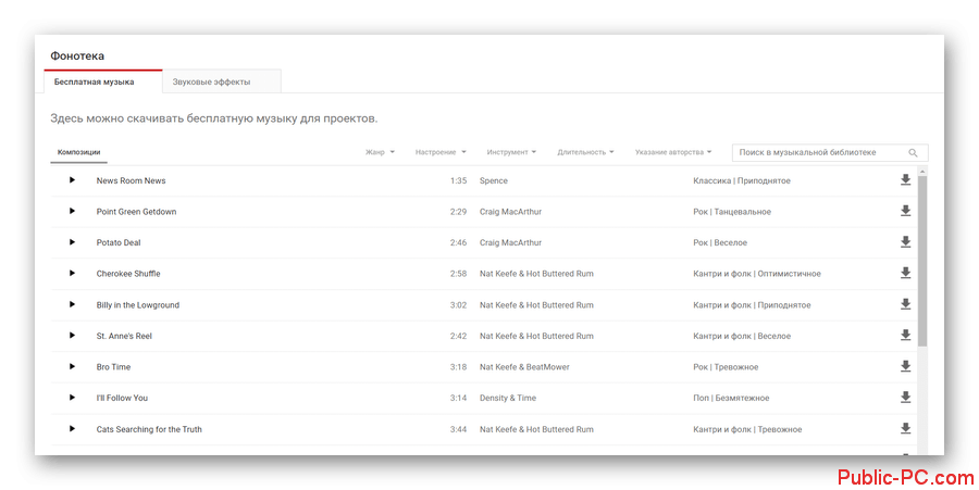 Разработчики YouTube запустили свой небольшой сервис, где пользователи могут слушать музыку. Он реализован больше как канал, но предоставляет больше музыкальных композиций, чем «Фонотека». Дополнительно можно отметить, что здесь больше категорий и некоторым пользователям может быть более удобно сортировать музыку по плейлистам. Однако, если вы привыкли к классической сортировке композиций по жанру, альбому, исполнителю и т.д., то у вас могут быть некоторые неудобства.
