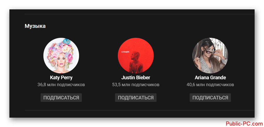Откроется страница с популярными каналами из разных категорий. Пролистайте её немного ниже до блока «Музыка».