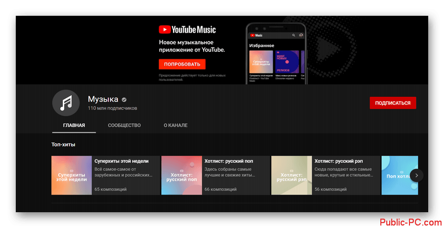 Другие популярные музыкальные исполнители тоже создают свои каналы, где размещают как просто музыку, так и различные клипы. Они представлены в отдельной вкладке на YouTube. Чтобы получить к ней доступ выполните следующие шаги: